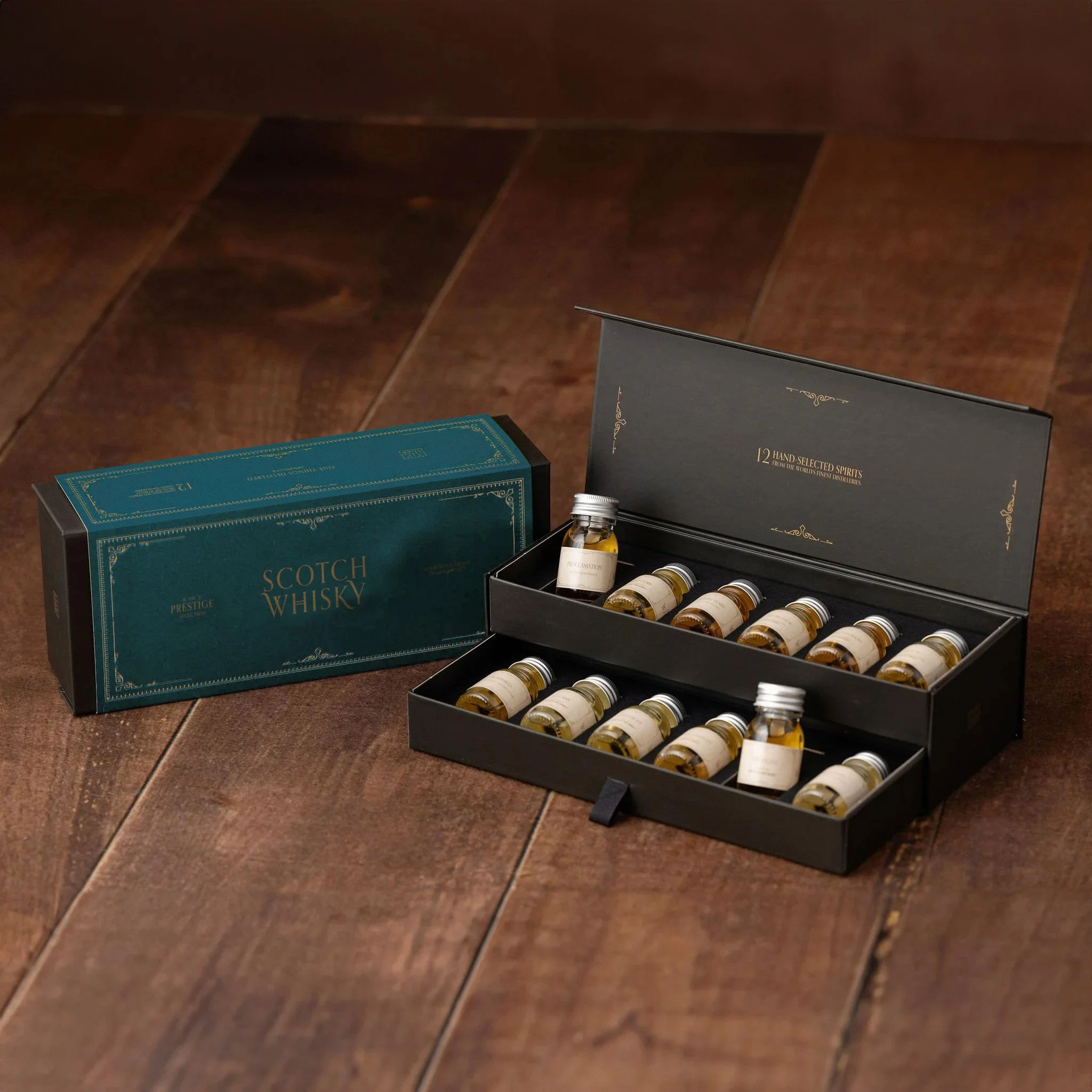 This Prestige Selection set includes 12 incredible whiskys from Scotland. Known for its exceptionally smooth liquid, the set includes blends, single malts and grain whiskeys that will not disappoint. Light the fire and settle in for a journey of discovery.!
